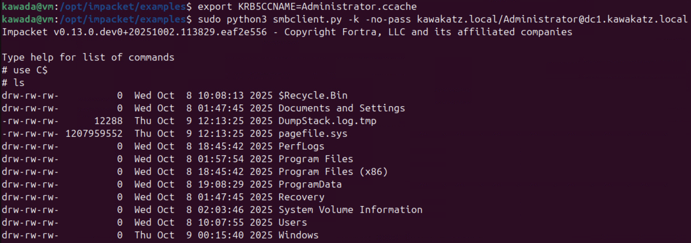 sudo python3 smbclient.py -k -no-pass kawakatz.local/Administrator@dc1.kawakatz.local