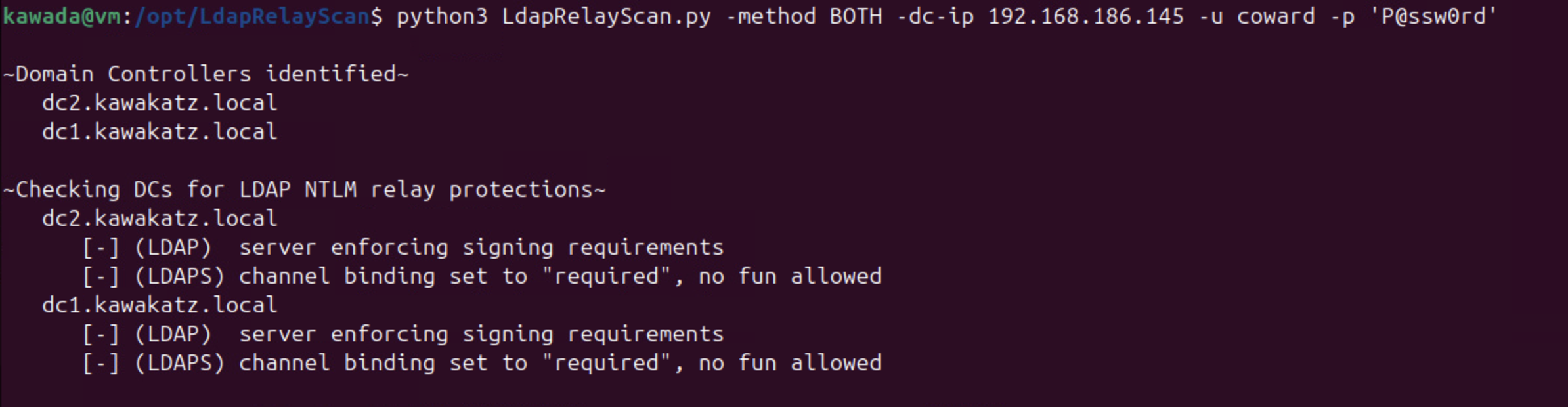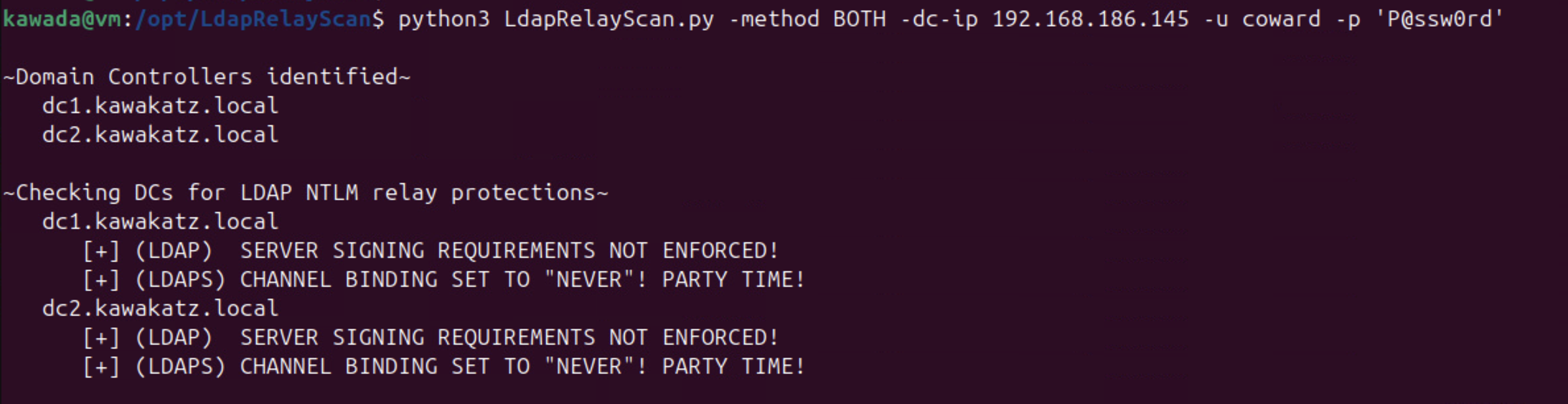 python3 LdapRelayScan.py -method BOTH -dc-ip <dc ip> -u coward -p 'P@ssw0rd'