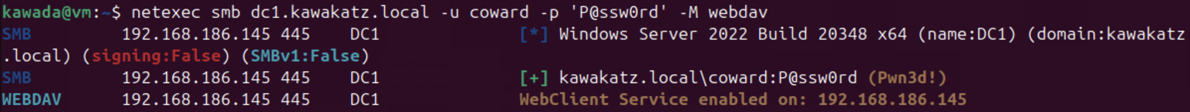 netexec smb dc1.kawakatz.local -u coward -p 'P@ssw0rd' -M webdav