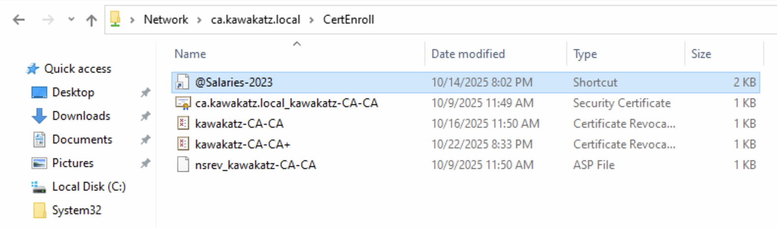 In this section, I’ll use a link file to coerce user authentication. The process is straightforward: place a malicious link file in a shared folder, as described in The Hacker Recipes. Once placed, any user who opens the folder will automatically authenticate to us. In this example, Administrator opens the folder and we relay the authentication with Impacket’s ntlmrelayx.py.