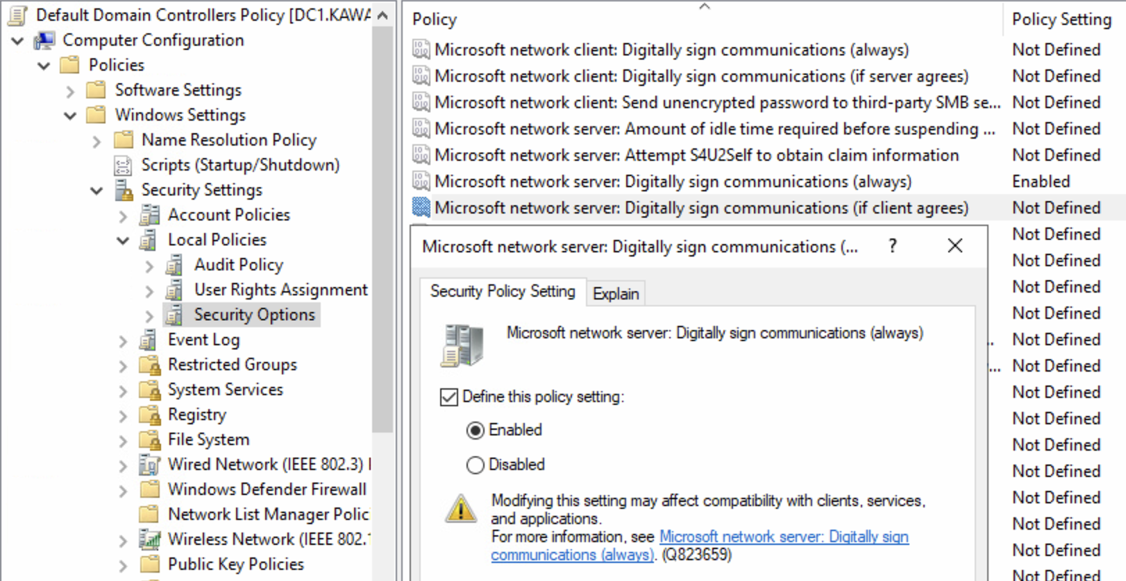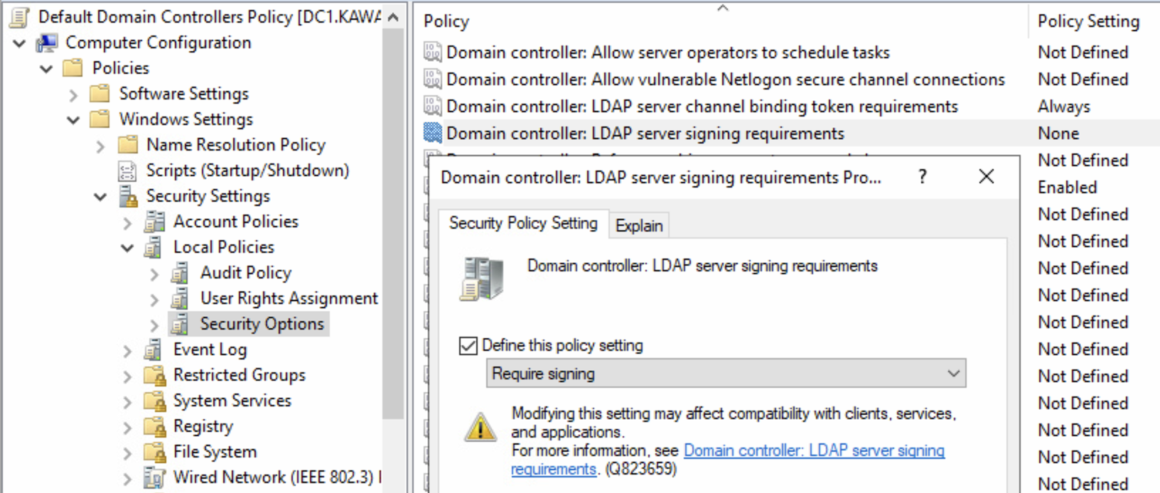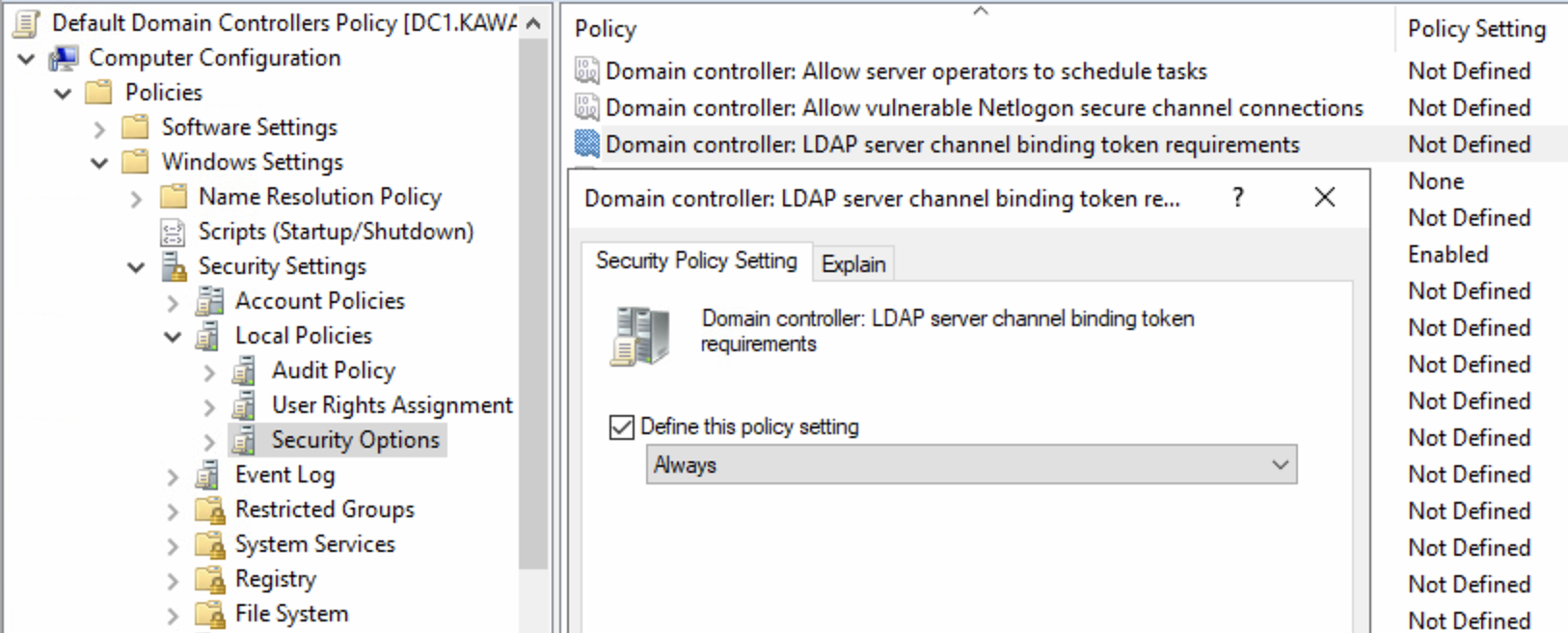 LDAP signing or LDAP channel binding must not be required to perform the relay attack. Historically this was the default. However, since Windows Server 2025, LDAP signing is required by default and channel binding is enabled in “When supported” mode. We can check these settings with LdapRelayScan. This patch may be required to support LDAPS. Additionally, some other complicated conditions must also be met as described below.