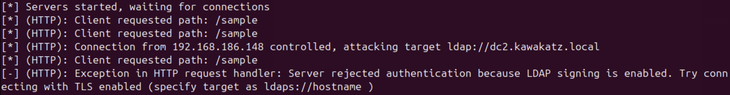 We can verify the behavior, and we can see that krbrelayx.py cannot continue the LDAP session. This is a common limitation across all Kerberos relaying techniques (over HTTP, DNS, and SMB). Without the session key from the AP-REQ, we cannot sign LDAP messages, so the server rejects the session after initial authentication.